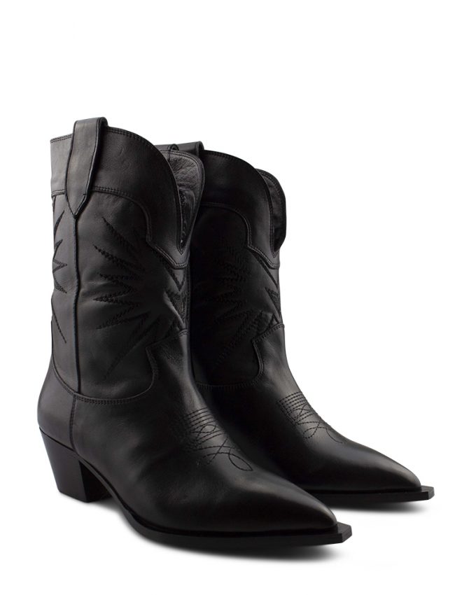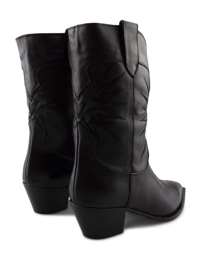 Met deze unieke cowboylaars bent u klaar om het nieuwe seizoen in stijl in te gaan! Het bovenwerk is gemaakt van hoogwaardig leer met zwarte stiksels en gemakkelijke lussen, de afgeronde schacht en de schuine blokhak die de laars zijn echte cowboy-look geven. De zool is van geribbeld kunststof en de kunststof hakpunt zorgt voor een goede grip. Het binnenwerk is van leer en het voetbed is uitneembaar. De spitse neus en het sterdessin geven hem een extra vrouwelijke touch, terwijl de cowboy accenten voor een iets stoerdere look zorgen.